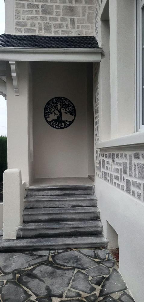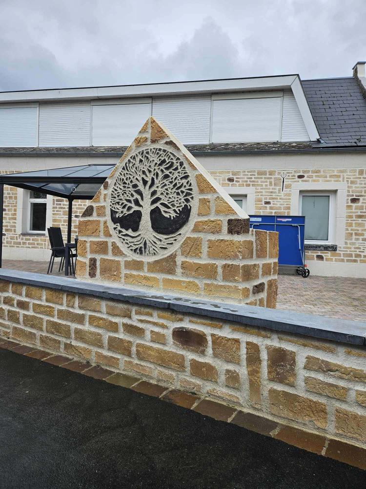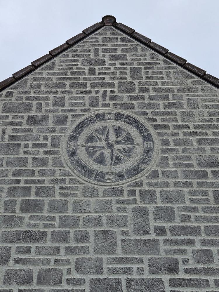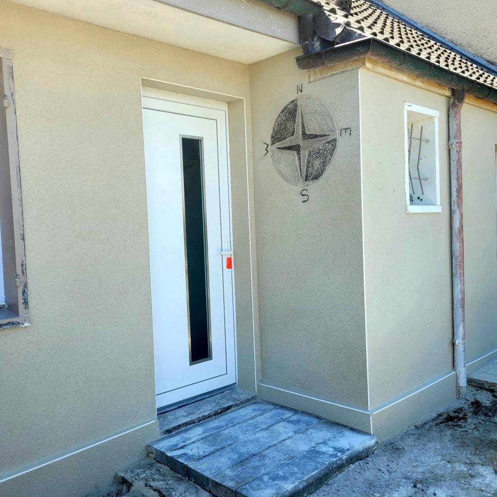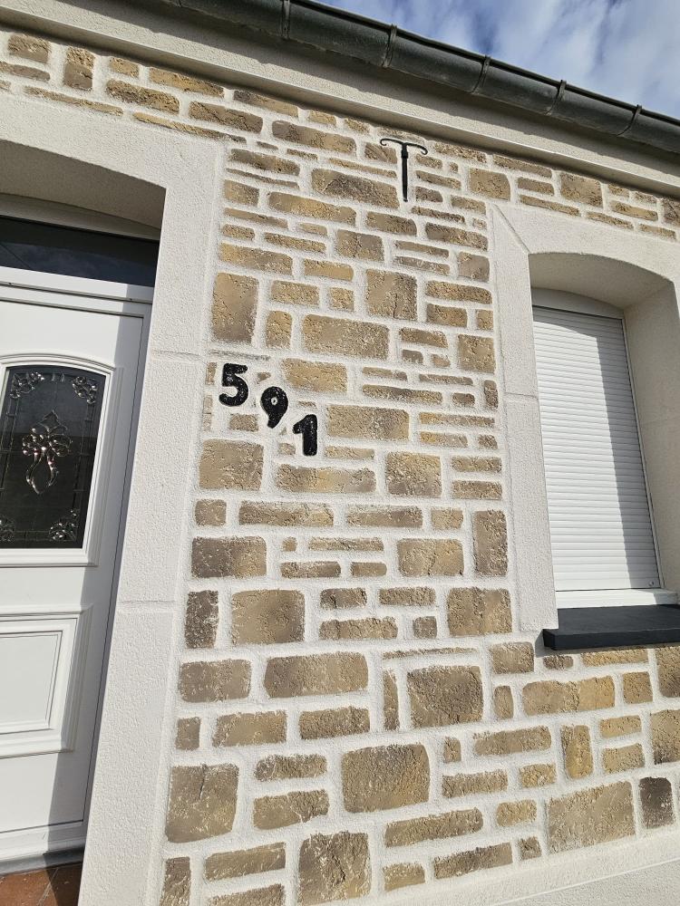 Énorme métamorphose pour cette superbe longère du XIXᵉ siècle, rénovée avec un enduit imitation pierre et des entourages en fausse pierre blanche avec joints apparents. Le tour de porte en pierre bleue d’origine, gravé de la date et des initiales des premiers propriétaires, a été soigneusement conservé pour préserver le charme authentique de la façade. Les appuis de fenêtre et couvre-murs en pierre bleue apportent une touche d’élégance supplémentaire, tandis que les murets et éléments décoratifs, dont le pot de fleurs, ont eux aussi bénéficié d’une finition imitation pierre. Une rose des vents sur le pignon du garage, traité dans le même esprit, vient parfaire cette rénovation de façade de caractère à Béthencourt, alliant savoir-faire artisanal et esthétique durable.