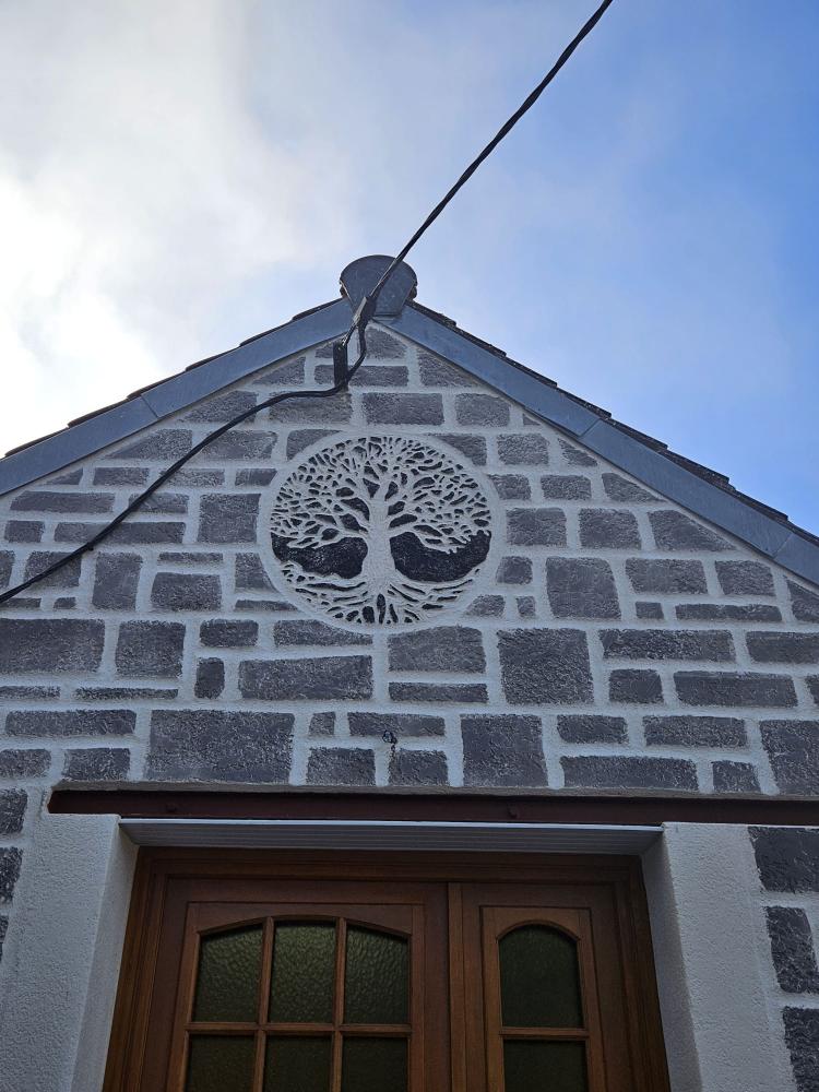 AB Pierres a réalisé un enduit décoratif imitation pierre grise, avec un encadrement blanc en fausse pierre autour des fenêtres et des chaînes d’angle apparentes, pour un rendu authentique et élégant. Le traçage des joints assure un réalisme parfait, tandis qu’un sous-bassement ton pierre grise protège durablement la façade des salissures, notamment liées aux animaux. Nous avons également procédé à la pose de pierres bleues de 5 cm en appui de fenêtre, à la repose des appliques lumineuses et à la mise en antirouille des ancrages métalliques, avant un lavage soigné des grès pour une finition propre et durable.